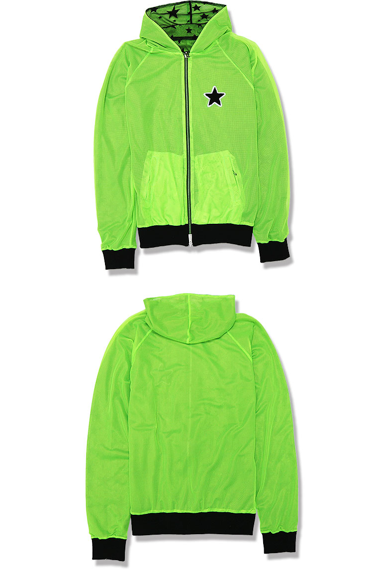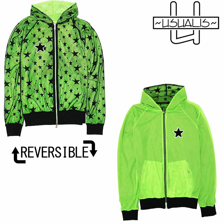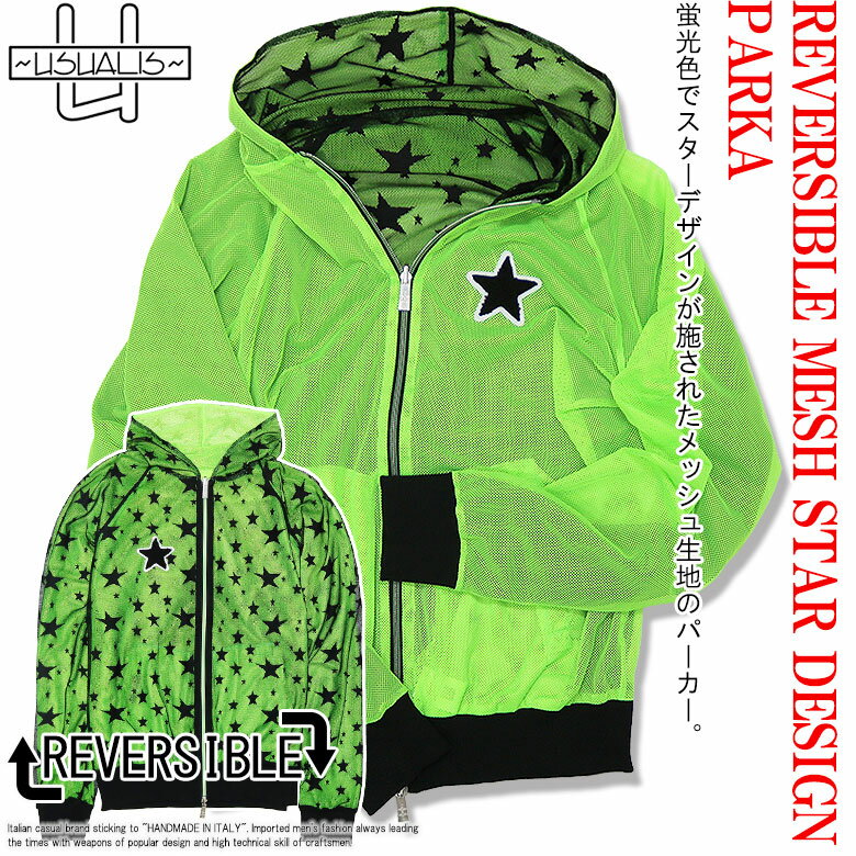 【USUALIS】ウザリス リバーシブルメッシュパーカー スター 星 蛍光色 メンズ パッチ 薄地 通気性